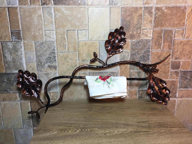 Цей залізний тримач для рушників ручної роботи стане чудовим доповненням будь- якої ванної кімнати або кухні. Він ідеально підходить для рушників біля раковини або для рушників для душу. Виконаний у вигляді гілки дуба з листям і жолудями, він має приємну гофровану структуру, схожу на справжню кору. Розміри: Висота: 25 см Довжина: 68 см Вага: 1 кг Кольори: чорний, покритий мідною патиною.