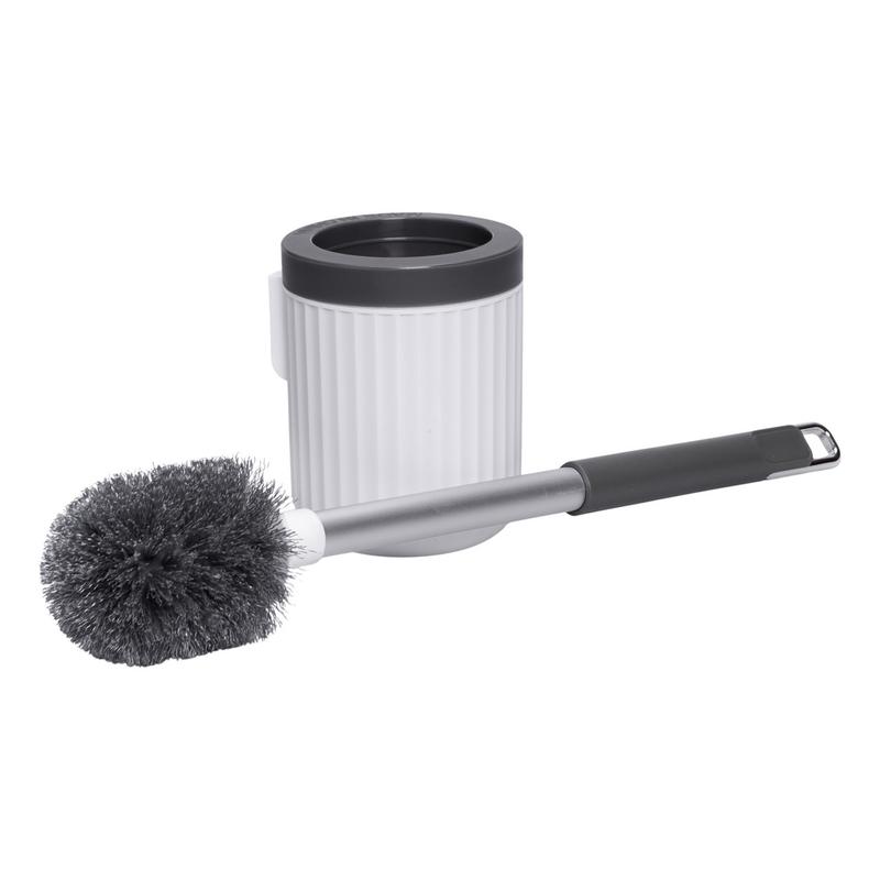 Йоржик для туалету з тримачем призначений для регулярного догляду за санвузлом. Компактна конструкція дозволяє розмістити набір поруч із унітазом, не займаючи зайвого простору. Тримач забезпечує стабільне вертикальне положення щітки, зменшуючи контакт із поверхнями. Ручка щітки має подовжену форму з ковзним захопленням у верхній частині, що сприяє зручному утриманню при очищенні. Стрижень виконаний з гладкого матеріалу, стійкого до вологи та легко очищається. Щетина щітки середньої жорсткості придатна видалення забруднень із внутрішніх поверхонь унітазу. Утримувач має рельєфну зовнішню поверхню та обідок, який фіксує щітку всередині, запобігаючи її випадковому способу. Конструкція дозволяє зберігати щітку в закритому положенні, що сприяє гігієнічності та зменшенню запахів. Набір підходить для повсякденного використання в домашніх умовах або у громадських санвузлах. Основні характеристики йоржика з підставкою для чищення унітазу: Діаметр: 11 см; Висота: 48 см; Матеріал: пластик; Тип установки: підлоговий. Особливості щітки для миття унітазу: Компактний набір зручно розміщується поруч із унітазом, не займаючи багато місця. Утримувач тримає щітку у вертикальному положенні, забезпечуючи чистоту навколо. Ергономічна ручка з покриттям, що не ковзає, робить прибирання комфортним. Середня жорсткість щетини ефективно справляється із забрудненнями. Стрижень легко очищається і не схильний до впливу вологи. Щітка зберігається у закритому положенні, що підтримує гігієнічність та зменшує запахи. Цей набір йоржика з підставкою стане практичним та гігієнічним рішенням для вашого санвузла. Компактна конструкція економить місце, а зручна ручка та фіксація щітки роблять прибирання комфортним та безпечним. Середня жорсткість щетини ефективно справляється із забрудненнями, а закрите зберігання підтримує чистоту та свіжість. Завдяки цьому набору прибирання туалету стає простим, швидким і максимально зручним.
