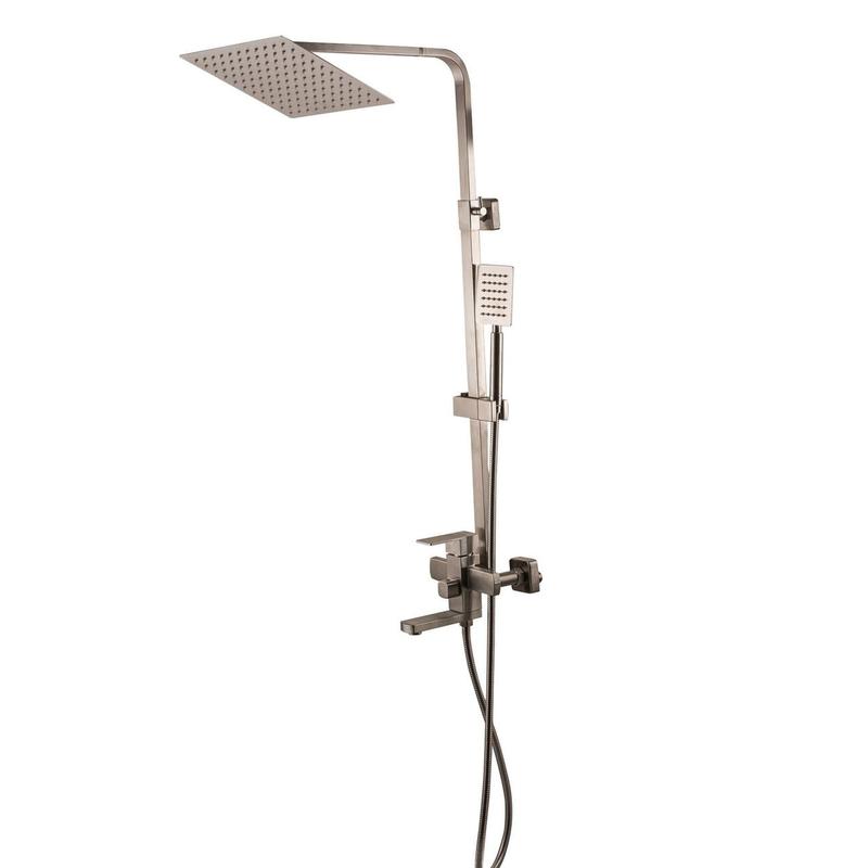 Душова система SICILIA PLUS-SBQ-SH-02-304 SUS304 Переваги душових систем Globus Lux: Матеріал: харчова нержавіюча сталь SUS 304 наявність верхнього душа короткого типу, «Ефект водоспаду», телескопічна душова штанга (регульована по висоті) всі душі оснащені системою проти вапняних відкладень, душовий шланг з посиленою обмоткою Комплектація душової системи: змішувач з нержавіючої сталі, верхній душ тримач для душа, душова штанга, кронштейн, перемикаючий вентиль, ручна лійка, шланг душовий