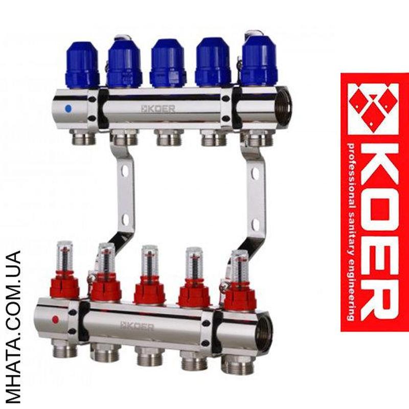 Коллектор для системы "теплый пол" koer на 5 выхода с термодатчиком и расходомером (чехия)
