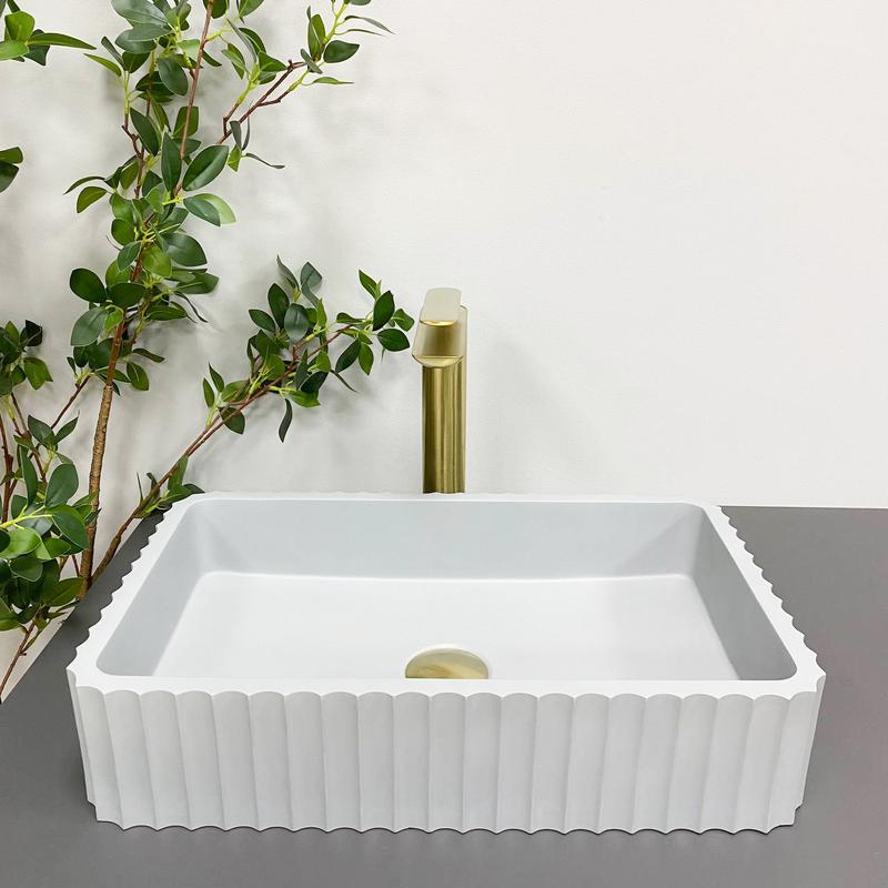Накладні раковини з колекції VBI FLORENTIA — мають сучасну прямокутну форму. Поверхня гладка всередині, а зовні рифлена текстура, що надає унікального вигляду. Універсальний дизайн дає змогу підібрати змішувач будь-якої форми. Раковина виготовлена з конгломерату, що вирізняється високими гігієнічними властивостями. Модель VBI FLORENTIA GREY — виготовлена в сірому кольорі з матовим покриттям.