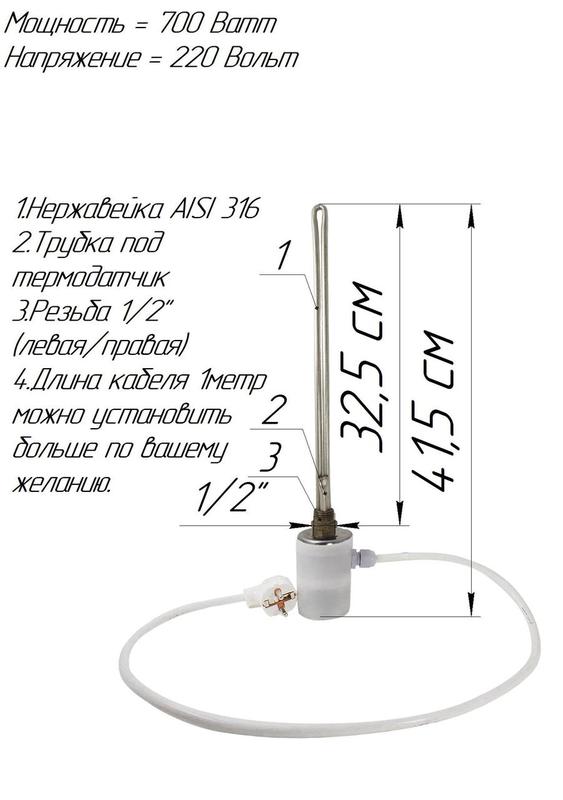 ТЕН з нержавіючої сталі для алюмінієвих радіаторів. Різьба 1/2" (ліва і права). Р=0,7 кВт L=325 мм з електронним термодатчиком 30-90С.