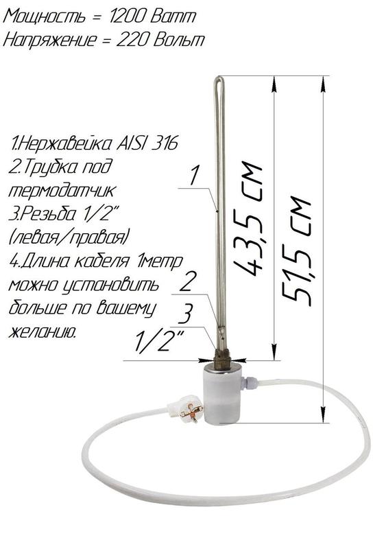 ТЭН из нержавеющей стали для алюминиевых радиаторов. Резьба 1/2" (левая и правая). Р=1,2 кВт L=325 мм с электронным термодатчиком 30-90˚С.