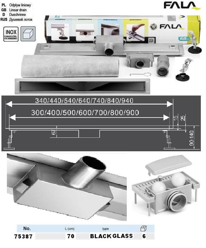 Трап для душу підлоговий black glass нержавійка 70 см fala-75387