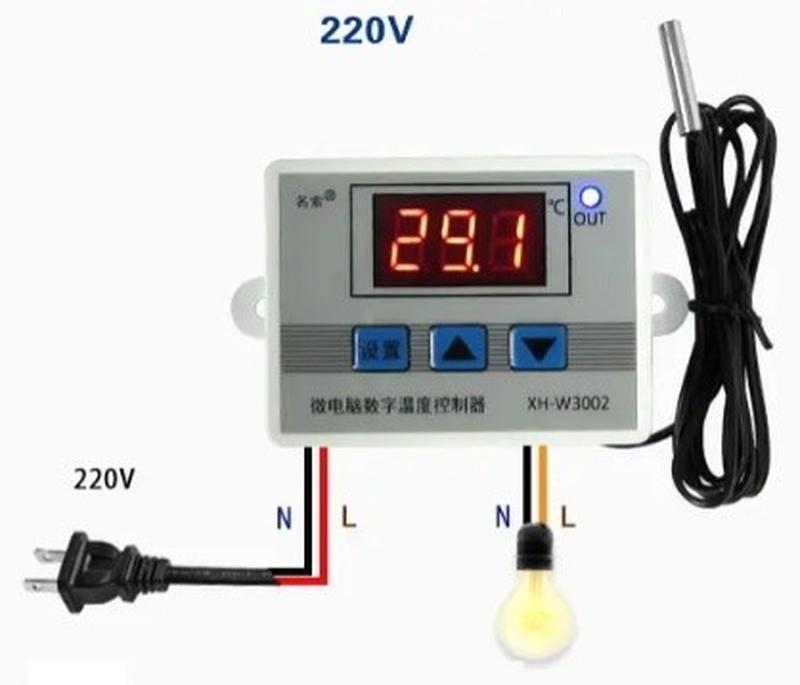 Ціна за одиницю, потрібну кількість уточнюйте. Характеристики й опис: напруга живлення АС 220В керування навантаженням до 1500Вт 220В АС програмування: Р0 – Температура включення – -55…+110 (заводське значення +25) Р1 – Температура вимкнення -55…+110 (заводське значення +40) Р2 – калібрування температурного датчика – -10…+10 (заводське значення 0) Р3 – Затримка включення – 0…10хв (заводське значення 0хв) Терморегулятор W3002 може працювати на нагрівання або охолодження. Якщо температура включення більша за температуру вимкнення, терморегулятор буде працювати в режимі охолодження. Якщо температура включення менша від температури вимкнення, терморегулятор буде працювати в режимі нагрівання. Налаштування терморегулятора зберігаються в енергонезалежну пам’ять мікроконтролера та відключення живлення приладу їх не змінює. Для повернення до заводських налаштувань потрібно одночасно натиснути дві кнопки та дочекатися появи – «888».