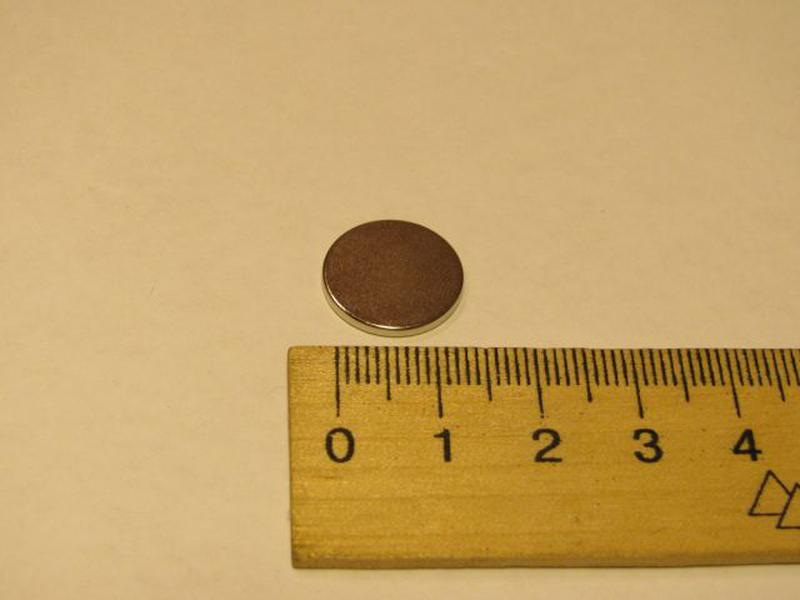 Кілька примірників у наявності Основні характеристики: Тип диск (шайба) Намагніченість N38 Сила зчеплення (приблизно), кг 1.5 Діаметр зовнішній, мм 15 Висота, мм 1,5 Вага, г 2 Об'єм, см3 0,265 Покриття Ni-Cu-Ni Робоча температура, ºС 80 Магнітна індукція (вимірювання на поверхні) Вг, мТл (Гаусс) 95 (950) Матеріал магніту (склад, формула) неодимовий магніт (NdFeB)