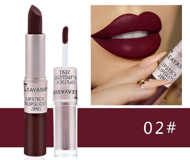 Двостороння матова помада для губ Lip Gloss & Lip Stick Teayason - це поєднання високої якості та доступної ціни. Насолоджуйся насиченими пігментами, рівномірним нанесенням і стійким результатом. Помада не сушить губи і не скочується. Ідеальний вибір для тих, хто хоче виглядати бездоганно протягом усього дня.