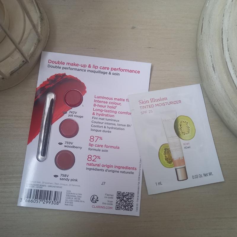 Набір пробників від Clarins:: 1) Помада для губ Clarins Joli Rouge Velvet Матова помада з маслом ши й екстрактом солеросу для живлення і зволоження губ, зразки на картці: 742V Joli Rouge, 759V Woodberry, 758V Sandy Pink, 3 шт. х 0,2 г 2) Основа-флюїд для обличчя Clarins Skin Illusion Зволожувальний тональний флюїд для обличчя, відтінок 02, пробний зразок, 1 мл