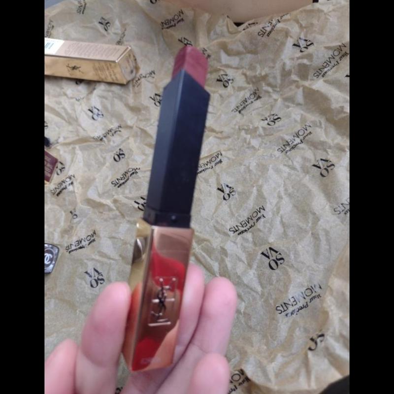 Шикарная бредовая помада с эффектом лаковой кожи, насыщенный цвет как на свотче с интернета, сделала свотч на пальце, растерла цвет чтоб было видно что имеет холодный малиновый подтон, а не терракотовый как кажется изначально. Очень красивая, в коробочке но без колпачка.