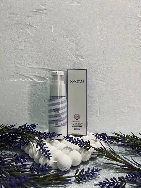 База під макіяж вирівнювальна Jomtam Nicotinamide Moisturizing Two Color Isolation Lotion, тон 01 фіолетовий, 35 мл База під макіяж дбайливо освітлює шкіру, має водовідштовхувальну властивість, не забиває пори та усуває зайвий шкірний жир, захищає шкіру від негативних впливів довкілля та передчасного старіння, перешкоджає сухості та зневодненню, покращує колір обличчя й робить макіяж стійкішим. База має ніжно-фіолетовий колір і легку текстуру, добре розтушовується й не змащується впродовж дня, не пересушує й не залишає відчуття маски. Фіолетовий колір усуває пожовтіння з обличчя. Нейтралізує тьмяний колір обличчя й надає шкірі внутрішнього сяйва. Спосіб застосування: після зволоження шкіри кремом нанесіть основу під макіяж і рівномірно розподіліть її на поверхні обличчя кінчиками пальців.