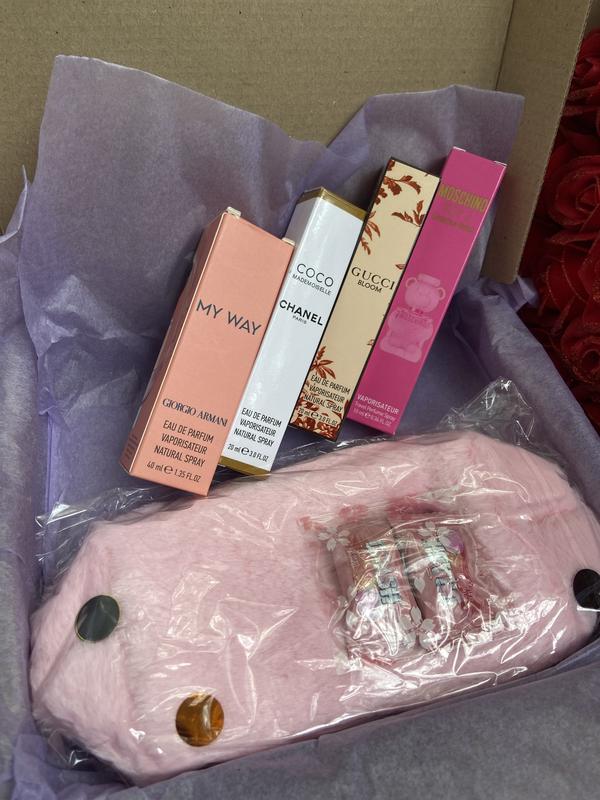 Подарункові набори, косметичка та парфуми, можна вибрати пакування в коробку або одразу в косметичку, парфуми можете вибрати на свій смак, ціна залежить від кількості парфумів, косметичка є в рожевому кольорі, фіолетовий та два білих