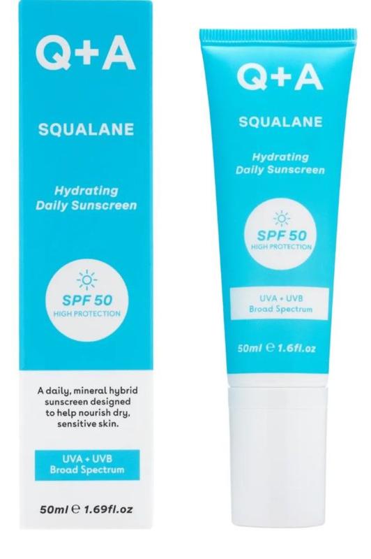Мікс натурального сквалану, бетаїну та олії пінника лугового є ідеальним рішенням для сухої та чутливої шкіри. Сквалан – це суха олія рослинного походження, яка виглядає точно так само, як власні жири вашої шкіри. Цей щоденний зволожуючий санскрін SPF50 містить унікальну фізично-хімічну суміш UF-фільтрів, які захищають шкіру від UVA/UVB – променів. Також склад багатий на спеціально підібрані активні компоненти, які допоможуть зробити шкіру оксамиво-м’якою на дотик. Фільтри: Фізичний – Titanium Dioxide; Хімічні – Uvinul A Plus, Uvinul T 150, Tinosorb S. Особливості Q+A Squalane Hydrating Daily Sunscreen: живить; надає еластичності; відновлює; зволожує; високоякісний захист SPF50 для тривалого захисту від сонця. Спосіб застосування: Нанесіть крем за 15 хвилин до виходу на вулицю. Для постійного та тривалого захисту регулярно повторюйте нанесення, а також повторно наносьте після перебування у воді та після фізичних вправ. Можна використовувати під макіяж.