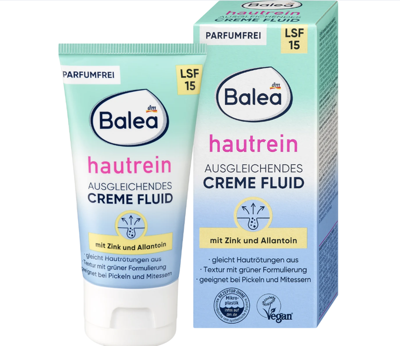 балансуючий крем-флюїд вирівнює почервоніння шкіри Зелене формулювання Balea Skin Balancing Cream Fluid допомагає від прищів і чорних крапок. Крем-флюїд з цинком і алантоїном оптично вирівнює почервоніння шкіри завдяки зеленій текстурі. У той же час крем для шкіри без парфумів захищає сонцезахисний фактор 15. Сумісність зі шкірою підтверджена дерматологічно без мікропластику та водорозчинних, чисто синтетичних полімерів Нанесіть на обличчя, шию та декольте вранці після очищення та легкими масажними рухами. Уникайте області навколо очей. AQUA | DIBUTYL ADIPATE | GLYCERIN | C12-15 ALKYL BENZOATE | ZINC OXIDE | DIETHYLAMINO HYDROXYBENZOYL HEXYL BENZOATE | POLYGLYCERYL-6 STEARATE | BIS-ETHYLHEXYLOXYPHENOL METHOXYPHENYL TRIAZINE | ETHYLHEXYL TRIAZONE | GLYCERYL STEARATE | SODIUM PHENYLBENZIMIDAZOLE SULFONATE | BEHENYL ALCOHOL | PHENOXYETHANOL | HYDROXYACETOPHENONE | TOCOPHERYL ACETATE | XANTHAN GUM | ALLANTOIN | CAPRYLYL GLYCOL | POLYGLYCERYL-6 BEHENATE | ZINC PCA | TRISODIUM ETHYLENEDIAMINE DISUCCINATE | SODIUM CHLORIDE | SODIUM SULFATE | CI 42090 | CI 10316.
