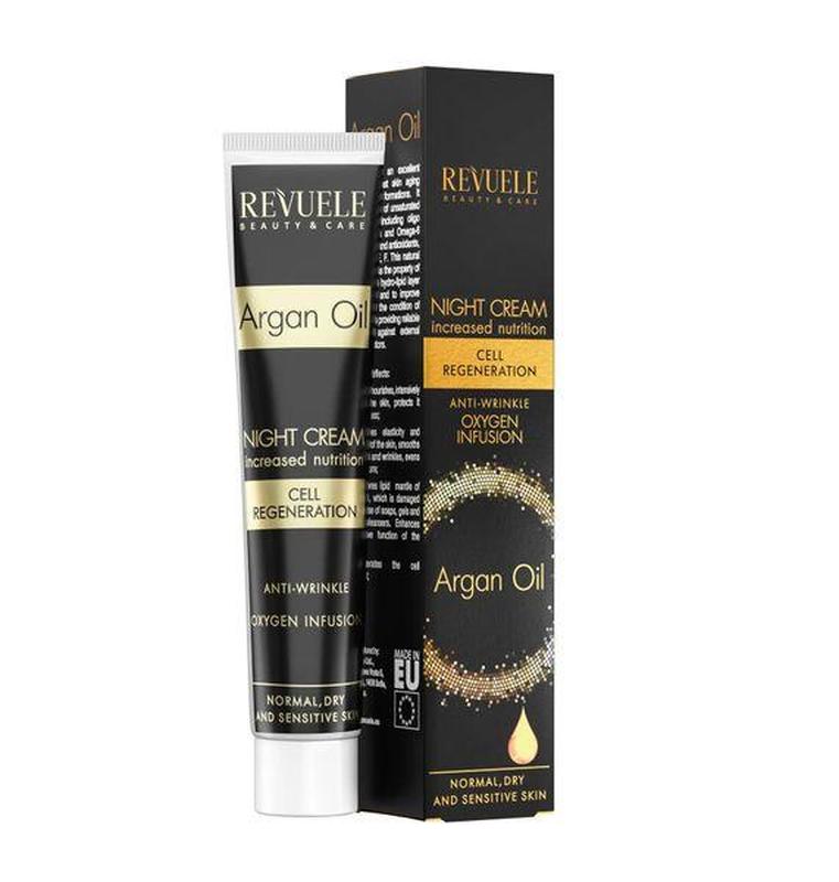 Крем для лица Revuele 50 мл. Argan Oil ночной с Аргановым маслом Роскошное аргановое масло - основной природный компонент крема - славится своими мощными антивозрастными, разглаживающими и ревитализирующими свойствами. Оно защищает от преждевременного старения и агрессивных экологических факторов, обогащает клетки полезными веществами, связывает свободные радикалы, нейтрализует окислительный стресс, сокращает морщины, борется с дряблостью и вялостью эпидермиса. Косметический продукт успокаивает кожу, устраняет чрезмерную сухость, поддерживает естественную гибкость кожного покрова, разглаживает микрорельеф лица и совершенствует его тон.