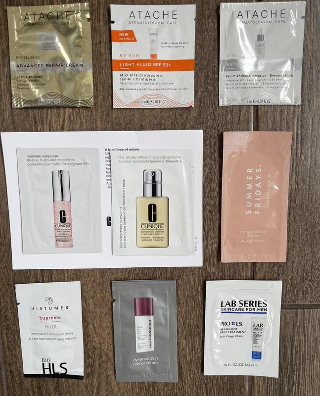 Набір із 9 пробників Atache Antiage v-b3 serum: retinol + niacinamid Інтенсивна омолоджувальна сироватка , що стимулює клітинну енергію ретинол + ніацинамід Atache Excellence Advanced Repair Cream Нічний антивіковий крем Atache Be Sun Light Fluid SPF 50+ Омолоджувальний Сонцезахисний Флюїд Histomer Supreme Filler — інтенсивний омолоджувальний крем-філер, забезпечує максимальний ефект розгладження й заповнення зморщок. В основу крем-філера лягли стовбурові клітини будлеї й активний біокомплекс Bio HLS Supreme Complex® Summer Fridays CC Me Serum Сироватка для обличчя з вітаміном C Dermalogica - dynamic skin retinol serum - Легка ретиноїдна сироватка з високими дозами в поєднанні зі скваланом допомагає зменшити видимість зморщок, зменшити текстуру, пори та нерівний тон шкіри Clinique Moisture Surge Eye 96-Hour Hydro-Filler Concentrate Зволожувальний гель для шкіри навколо очей на 96 годин Clinique 3 Steps Dramatically Different™ Moisturizing Lotion+ зволожувальна емульсія для сухої й дуже сухої шкіри Lab Series Pro LS All-In-One Face Treatment Засіб для догляду за шкірою для чоловіків