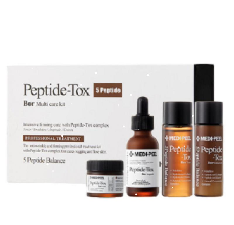 Склад набору: Пептидний тонер для особи - Medi-Peel Bor-Tox 5 Peptide Toner, 30ml + Пептидний емульсія для обличчя - Medi-Peel Bor-Tox 5 Peptide Emulsion, 30ml + Антивікова сироватка для обличчя - Medi-Peel Bor-Tox 5 Peptide Ampoule, 30ml + Антивіковий крем для обличчя - Medi-Peel Bor-Tox 5 Peptide Cream, 50g