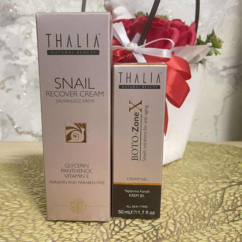 Виробник Туреччина сертифікована косметика 💜💜💜Денний омолоджуючий крем для обличчя з муцином равлика THALIA, 50 мл Завдяки вмісту алантоїну в складі крем підтримує природну регенерацію шкіри, запобігає появі подразнень, утримує вологу, пом’якшує шкіру та бореться з її сухістю. Пантенол і вітамін Е відновлюють шкірний покрив після висипань та прищів, живлять тьмяну шкіру, повертаючи їй здоровий колір. За регулярного користування кремом ви помітите суттєве омолодження шкіри обличчя та шиї, відчуєте її підвищену пружність і гладкість. Не містить шкідливих для здоров'я речовин, таких як парабени та парафіни. 💟💟💟Омолоджуючий гель-крем THALIA BOTO-ZoneX, 50 мл Революційний гель-крем BOTO-ZoneX базується на anti-age технології нового покоління Niozom. Вона доводить, що зморшки можна скоротити на 38% усього за місяць! Комплекс гексапептидів-19 у складі – це повноцінний натуральний замінник ботоксу, що активно бореться з проявами старіння, глибокими зморшками та складками, запобігаючи появі нових. Коктейль із олії насіння чіа, гіалуронової кислоти й екстракту кори магнолії, приправлений вітаміном Е, запобігає втраті еластичності та підвищує пружність шкіри обличчя. Надлегка гелева текстура дозволяє активним компонентам проникати до більш глибоких шарів шкіри. Не містить парабенів, парафіну, тваринних жирів і шкідливих для здоров‘я речовин.