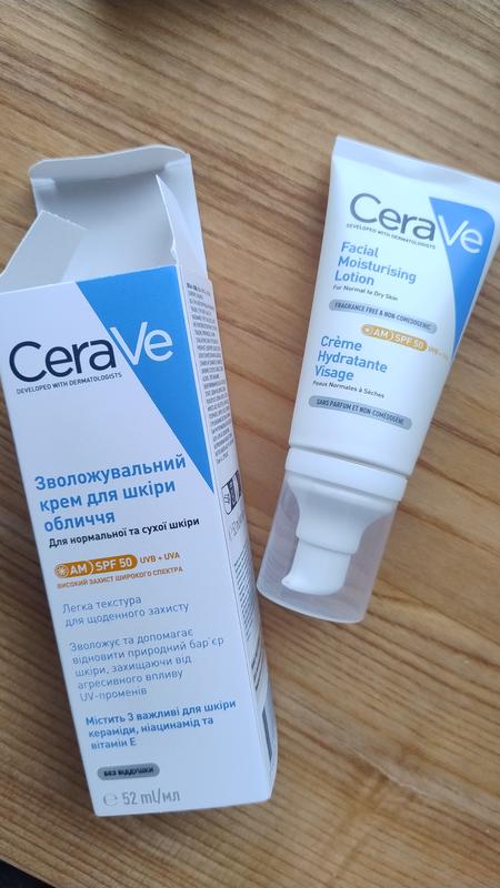 крем новий оригінал з дозволом термін 2028рік Особливості Facial Moisturising Lotion SPF 50 від CeraVe: - легка консистенція добре абсорбується; - не утворює липкого шару та жирного блиску; - зовсім не дисонує з декоративною косметикою; - можна використовувати як основу під макіяж; - збагачений відновлювальними керамідами та вітамінами; - інтенсивно зволожує шкіру; - нормалізує та підтримує її гідробаланс; - запобігає трансепідермальній втраті води; - зміцнює захисний бар'єр та ліпідну мантію; - посилює гладкість, пружність та еластичність епідермісу; - позбавляє його від сухості, почервоніння та подразнення; - запобігає повторній появі ознак дегідратації.