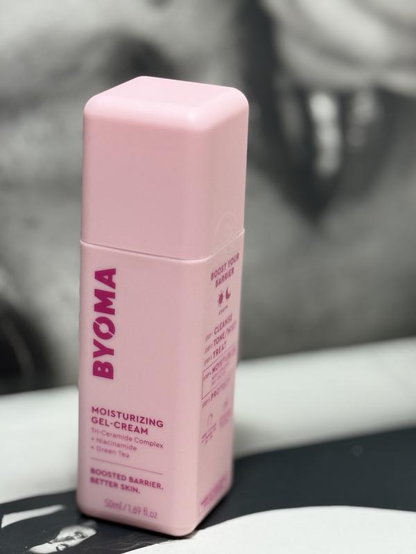 Оригінал з сефори Byoma Moisturising Gel Cream легкий безмасляний гель-крем з власним Tri-Ceramide Complex (церамиди, холестерин, жирні кислоти), ніацинамідом та зеленим чаєм, який одночасно глибоко зволожує, зміцнює бар’єр і зменшує чутливість шкіри, підходячи навіть для жирної та проблемної шкіри без забивання пор.