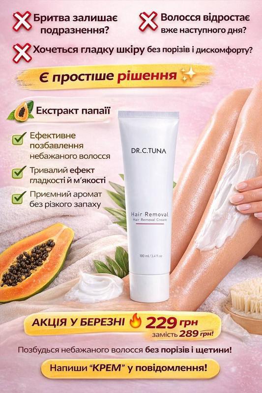 Гладенька шкіра без бритви ✨ Крем для депіляції з новою формулою ефективно видаляє небажане волосся та допомагає зменшити його ріст завдяки екстракту папайї. Переваги: ✨ швидке та легке видалення волосся ✨ глибоке зволоження шкіри ✨ шкіра стає гладенькою та м’якою ✨ приємний аромат без різкого запаху Підходить для використання: ✔ ноги ✔ руки ✔ зона під пахвами Ціна — 229 грн Пишіть у повідомлення, щоб замовити 💌