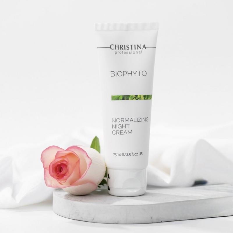 Christina Bio Phyto Normalizing Night Cream (75 мл), професійний нічний крем ізраїльського бренду Christina, призначений для відновлення пошкодженої та схильної до лущення шкіри Крем діє під час нічного циклу регенерації епідермісу, забезпечуючи комплексний догляд: Відновлення: усуває лущення та сприяє регенерації клітин. Заспокоєння: має протизапальну дію, зменшує почервоніння та подразнення. Нормалізація: регулює виділення себума та матує шкіру. Зміцнення: відновлює природний ліпідний бар’єр та стінки капілярів (корисно при куперозі). 1️⃣2️⃣0️⃣0️⃣