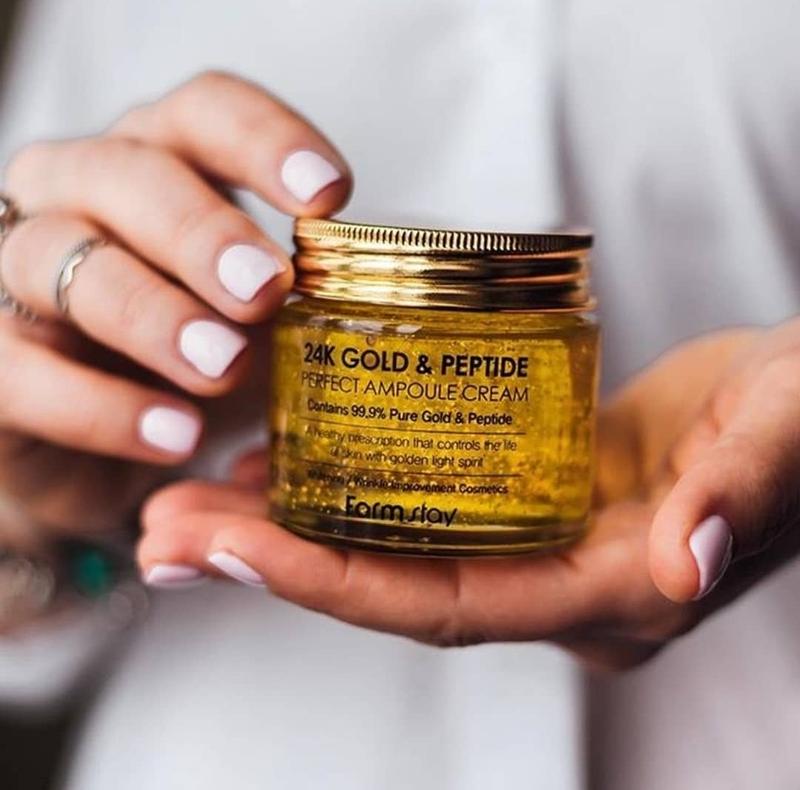 Код 882 Антивіковий крем із золотом і пептидами FarmStay 24K Gold & Peptide Perfect Ampoule Cream має інтенсивну омолоджуючу дію на шкіру, підвищує її пружність і еластичність, бореться з наявними зморшками і перешкоджає появі нових, вирівнює тон обличчя та освітлює вікову. Глибоко зволожує шкіру та насичує її вітамінами. Колоїдне золото сприяє максимально швидкому та глибокому проникненню їх у шкіру, забезпечує інтенсивний ліфтинг, насичує шкіру вологою та киснем. Нині у косметології використовують золото, яке виконує відразу кілька функцій. Воно не тільки має бактерицидну дію, але й значно підвищує здатність шкіри до поглинання, збереження вологи та є чудовим «провідником» для біологічно активних компонентів. Маточне молочко забезпечує тривале зволоження сухої шкіри. Маточне молочко, багате на поживні речовини, є кондиціонером для полегшення оновлення клітин шкіри. Молочко має природні регенеруючі, живильні та стимулюючі властивості, надає сяйва та життєвої сили для всіх типів шкіри. Пептиди – це речовини органічного походження, які активно впливають стан шкіри обличчя. Пептиди сприяють розгладжуванню зморшок, і протистоять появі нових, підвищують еластичність і пружність шкіри, покращують колір обличчя, мають інтенсивну зволожуючу дію. Пептиди відновлюють контур обличчя та сприяють регенерації клітин, запускаючи процеси самовідновлення. Спосіб застосування: нанесіть необхідну кількість крему на обличчя та розподіліть масажними рухами. Об'єм: 80 мл.