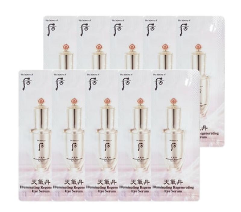 Сыворотка для век The History of Whoo Illuminating Regenerating Eye Serum пробник Шелковистая питательная сыворотка, разработана для нежной кожи вокруг глаз. Эффективно борется с морщинами, восстанавливает и осветляет тусклую кожу.После регулярного применения кожа становится более эластичной, упругой и яркой. Сыворотка входит в серию средств Cheongidan Regenerating (Hwa Huyn) «Сияющее здоровье» - это восстанавливающая, омолаживающая и оздоравливающая линия, созданная на основе комплекса восточных лекарственных трав 30 видов. Линия Hwa Hyun обладает омолаживающими свойствами, минимизирует глубину морщин и противостоит появлению новых, эффективно укрепляет упругость кожи. Оптимизирует гидролипидный баланс, разглаживает текстуру кожи. Восстанавливает жизненную энергию, увлажняет, очищает. Выравнивают цвет лица и помогает справиться с проблемами возрастной кожи (сухость, пигментация и т.д.), повышает влагоудерживающую способность кожи. Укрепляет стенки сосудов, способствуют выведению токсических веществ и излишка жидкости из клеток. Благодаря натуральным компонентам: экстракту корня дикого женьшеня, экстракту корня купены лекарственной, экстракту дудника, экстракту дикого лимона, экстракту оленьих рогов, экстракту лекарственной магнолии, маслу абрикосовых косточек, оливковому масла, экстракту малины, экстракту пории кокосовидной, жемчужной пудре, − средство обладает восстанавливающими и омолаживающими свойствами. Способ применения: использовать утром и вечером, наносить небольшое количество вокруг всей области вокруг глаз. Нанести плавно от внутреннего уголка глаза к внешнему. Расход минимальный. Обьем 10мл - набор 10 саше