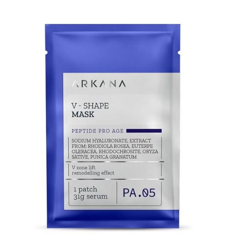 Описание: Маска V-образной формы идеально подходит как дополнение к профессиональным процедурам в домашнем уходе, а также в качестве домашней "банкетной" процедуры. Технология SecondSkin100. Обладает эффектом разглаживания морщин и предотвращает образование новых. Натуральный увлажняющий фактор (NMF) в сочетании с гиалуроновой кислотой помогает восстановить естественный уровень влаги в коже и длительно поддерживать ее баланс. Благодаря экстракту родиолы розовой, происходит тонизирующее действие, предотвращение морщин и потери упругости. Состав: AQUA, BUTYLENE GLYCOL, TRIMETHYLOPROPANE TRICAPRYLATE/TRICAPRATE, CETEARETH-20, CETEARYL ALCOHOL, CETETH-24, CHOLETH-24, DIMETHICONE, DISODIUM EDTA, GLYCERIN, GLYCERIN DS, SODIUM HYALURONATE, PROPYLENE GLYCOL, STEARETH-2, XANTHAN GUM, NIACINAMIDE, HYDROXYETHYL UREA, UREA, LEUCONOSTOC / RADISH ROOT FERMENT FILTRATE, ORYZA SATIVE (RICE) EXTRACT, PUNICA GRANATUM FRUIT EXTRACT, RHODIOLA ROSEA ROOT EXTRA GLYCYRRHIZATE, SOLUBLE COLLAGEN , EUTERPE OLERACEA FRUIT EXTRACT, RHODOCHROSITE EXTRACT, CHLORPHENESIN, PHENOXYETHANOL, IODOPROPYL BUTYLCARBAMATE. Способ применения: Форма маски позволяет индивидуально ее корректировать. Извлеките маску из упаковки и поместите ее на лицо. Снимите маску через 15-20 минут и распределите остатки эмульсии по массажным линиям. При курсовом использовании маски (3-7 процедур) улучшается овал лица. Дизайн упаковки может меняться производителем