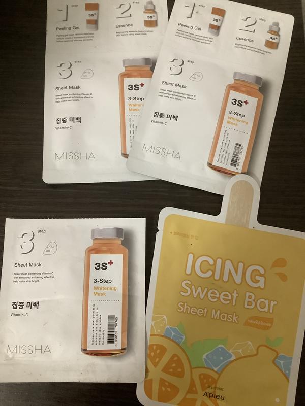 Missha 3-Step Whitening Mask — освітлювальна маска для обличчя, розроблена на основі тканини, що «дихає» і робить її більш ефективною. Косметичний продукт триразовий і складається з гель-пілінгу, есенції і, безпосередньо, маски. Засіб містить вітамін С, який не тільки сприяє освітленню шкірного покриву, але і також запобігає передчасному старінню. Спосіб застосування: 1. Нанести гель-пілінг і промасажувати шкіру, змити теплою водою. 2. Нанести есенцію для живлення шкіри. 3. Нанести маску і залишити на 20-30 хвилин. Вона постачає активні інгредієнти глибоко в шкіру. 1 шт 70 грн. При покупке двух штук, две маски, которые на фото - в подарок
