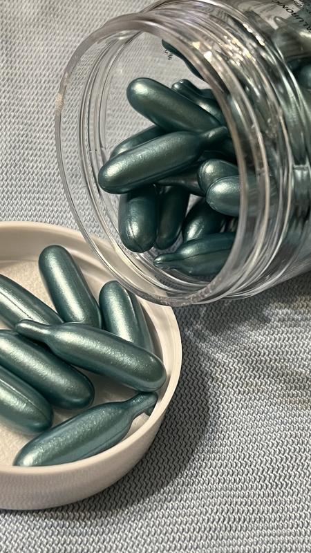 Капсули з гіалуроновою кислотою + вітаміном В5 (пантенол). Надає шкірі зволоження і заспокоєння. В баночці 51 капсула з 60.
