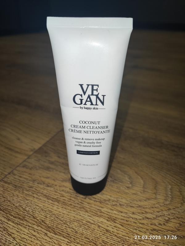. Coconut Cream Cleanser від бренда Vegan By Happy збагачений натуральним кокосовим маслом і екстрактом алое вера. Синергія активних компонентів сприяє інтенсивному зволоженню шкіри під час і після її очищення. Разом із стійким брудом функціональний засіб усуває наявні недоліки та запобігає їхній повторній появі. Він справляється із сальними пробками, чорними цятками, декоративною косметикою. Б’юті-продукт пом’якшує загрубілі ділянки шкіри, прискорює її обмінні процеси, кровообіг, тонізуючи. Як результат – бездоганне дзеркальне відображення і тривале відчуття прохолоди. Виробник Іспанія