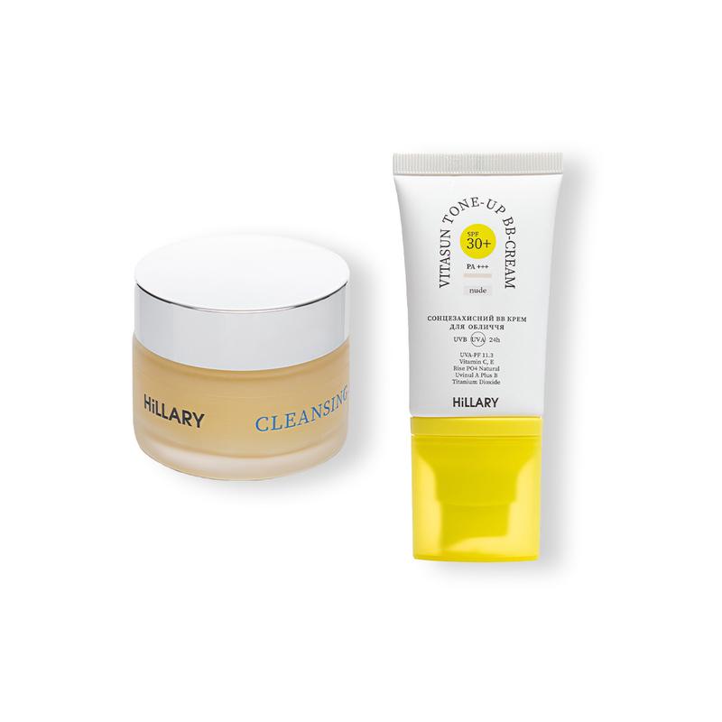Наш преміумний набір догляду за шкірою цього сезону - це ідеальне поєднання натуральних інгредієнтів та ефективності. Ніжний бальзам ефективно видаляє макіяж і бруд, не подразнюючи шкіру та не залишаючи на ній неприємної жирної плівки. Бальзам на основі мигдальної олії та ефірів ши має консистенцію, що нагадує чисту олію ши та легко тане на сухій шкірі обличчя, очей і губ. Розчиняє залишки декоративної косметики та очищує пори від надлишків шкірного себуму. При контакті з водою перетворюється на ніжне молочко. Легко змивається, не залишаючи жирної плівки. Базовий денний крем для догляду за шкірою в умовах міста. Захищає від широкого спектра УФ-випромінювання, робить шкіру ніжною та натурально сяючою, вирівнює тон обличчя, маскує недосконалості шкіри. Завдяки поєднанню новітнього хімічного сонцезахисного фільтра та антиоксидантів-вітамінів Е та С, дію яких підсилено діоксидом титану, ВВ-крем ефективно захищає від сонячного випромінювання в UVAI та UVAII спектрі, запобігає фотостарінню та появі гіперпігментації. Універсальний відтінок адаптується до кольору шкіри, створюючи невагоме покриття з оксамитовим фінішем. Завдяки комплексу унікальних натуральних абсорберів, крем контролює виділення шкірного сала та створює "soft focus effect" - вирівнює тон та поверхню шкіри, роблячи зморшки менш помітними. До набору входять: - Сонцезахисний BB-крем для обличчя SPF30+ Nude HiLLARY VitaSun Tone-Up BB-Cream All Day Protect SPF30+, 40 мл - Очищувальний бальзам для зняття макіяжу для всіх типів шкіри Hillary Cleansing Balm Almond + Shea, 50 мл Спосіб застосування: 1. Нанесіть очищувальний бальзам пальцями на сухе обличчя, зокрема губи й очі. Злегка помасажуйте, потім додайте трохи води й знову м'яко помасажуйте, щоб олія перетворилася на молочну емульсію. Ретельно змийте водою. 2. Невелику кількість крему spf нанесіть на очищену шкіру обличчя дуже тонким шаром. Зачекайте 2-3 хв та нанесіть другий тонкий шар. В умовах пляжу чи тривалого передування на активному сонці необхідно оновлювати захист кожні 2 години.