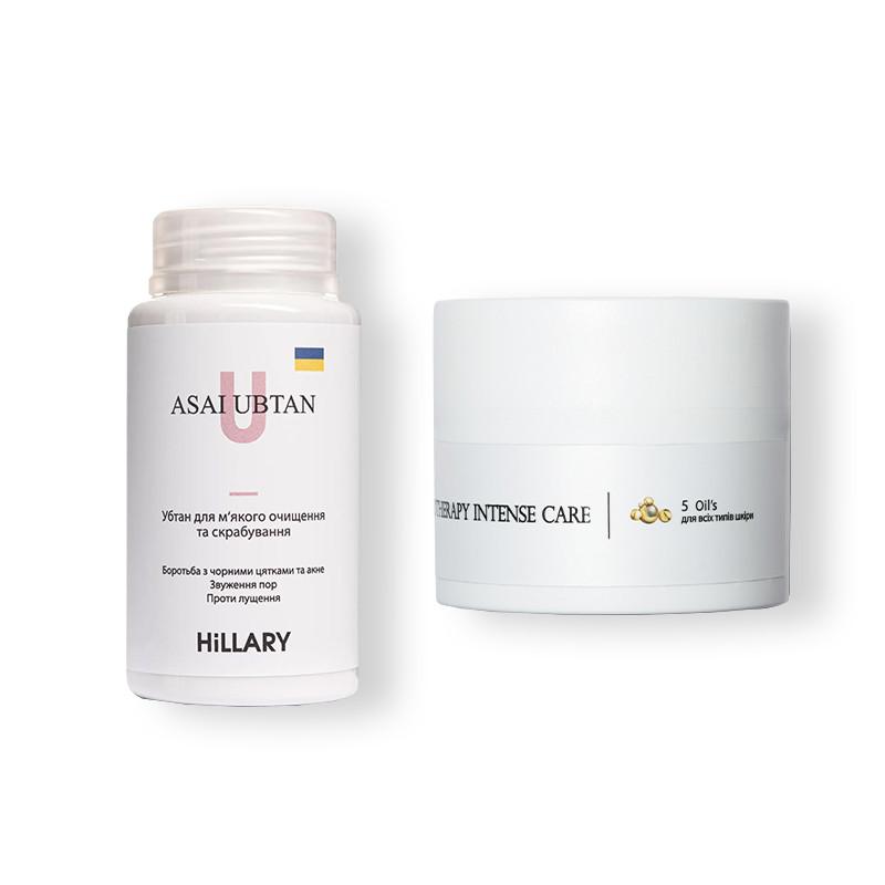 Догляд за шкірою обличчя для чоловіків - Must have у сучасних умовах життя. Чоловіча шкіра дуже страждає від забруднень, потовиділення і жорсткої води. Догляд за обличчям для чоловіків така ж необхідність, як щоденне гоління і умивання. Потужний вплив тютюну, алкоголю, сонця, щоденна процедура гоління, використання спиртових лосьйонів і пінок для гоління залишають зморшки і роблячи шкіру чутливою, а велика кількість шкірного сала на шкірі у чоловіків провокує жирний блиск і появу вугрів. Шкіра чоловіків більш пружна і щільна, завдяки 2 природним бонусам - тестостерону і колагену. Але догляд за шкірою не сильно відрізняється від жіночого. Ми підготували універсальні засоби для щоденного догляду за шкірою обличчя чоловіків. Крем Corneotherapy Intense Сare 5 oil's для всіх типів шкіри містить в складі ідеально поєднані рослинні олії, співвідношення вмісту жирних кислот яких максимально задовольняє потреби шкіри. Крем поповнює втрату вологи, регулює гідроліпідний баланс шкіри і захищає її від негативних зовнішніх факторів. Убтан для м'якого очищення і скрабування Hillary ASAI UBTAN в 3 рази зменшує кількість чорних точок, відлущує ороговілі клітини і надає шкірі обличчя сяючого вигляду, робить шкіру еластичнішою, а вікові зміни шкіри менш помітними, глибоко очищає пори, усуває запальний процес, зволожує, не сушить шкіру, ніжно і дбайливо очищає її, не викликає подразнень чи будь-яких неприємних відчуттів, сприяє зменшенню постакне і пігментації та не порушує мікробіом шкіри. До набору входять: - Крем для всіх типів шкіри Hillary Corneotherapy Intense Сare 5 oil's, 50 мл; - Убтан для м'якого очищення і скрабування Hillary ASAI UBTAN, 100 г. Спосіб застосування: 1. Невелику кількість порошку убтану насипте на руку, додати трохи води та розвести до пастоподібного стану. Нанести на зволожене обличчя, обережно розподілити по всьому обличчю, помасажувати та змити. Можна застосовувати два-три рази на тиждень. 2. Невелику кількість крему нанесіть масажними рухами на попередньо очищену шкіру обличчя, втираючи до повного всмоктування.