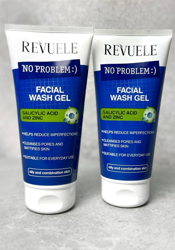 REVUELE NO PROBLEM НІЖНИЙ ГЕЛЬ ДЛЯ ВМИВАННЯ ОБЛИЧЧЯ САЛІЦИЛОВА КИСЛОТА ТА ЦИНК Цей очищаючий гель видаляє з обличчя бруд, жир і залишки макіяжу, а також глибоко очищує забиті пори. Результат -- гладка та свіжа шкіра з менш видимими порами, меншою кількістю висипань і відсутністю жирного блиску. Призначений для жирної та комбінованої шкіри, підходить для щоденного використання. Склад Water / Aqua, Sodium Lauroyl Sarcosinate, Cocamidopropyl Betaine, Glycerin, Sodium Lauryl Sulfate, Hydroxyethylcellulose, PEG-40 Hydrogenated Castor Oil, Vitamin B3 / Niacinamide, Salicylic Acid, Propylene Glycol, Burdock Root Extract / Arctium Lappa Root Extract, Watercress Leaf Extract / Nasturtium Officinale Leaf Еxtract, Salvia Оfficinalis Leaf Еxtract, Alcohol Denat, Phenoxyethanol, Zinc PCA, Allantoin, Tea Tree Leaf Oil / Melaleuca Alternifolia Leaf Oil, Sage Oil / Salvia Officinalis Oil, Fragrance / Parfum, Disodium EDTА.