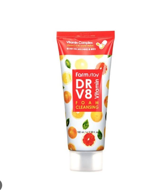 ТЕРМІНІ 2026.12.01 Пінка для вмивання з вітамінним комплексом інтенсивно очищає шкіру, виводить усі типи забруднень, знімає напруження та заряджає енергією. Пінка активно проникає глибоко в пори, виводячи звідти всі забруднення й дбайливо розчиняючи їх. Вона ефективно видаляє залишки косметики, поту, жиру та пилу, виводить токсини, абсорбує зайву жирність, надає обличчю свіжий колір і доглянутий вигляд. Пінка пригнічує мікроби, запобігає розвитку інфекцій, знімає запалення, заспокоює подразнення, покращує кровообіг, запобігає розвитку комедонів і сальних пробок. Засіб створює рясну піну з однієї маленької горошини, тому слугуватиме вам довго та допоможе добре заощадити. Основні компоненти Очисна пінка для сяйва шкіри обличчя з комплексом вітамінів FarmStay DR.V8 Vitamin Foam Cleansing, 100 мл Аскорбінова кислота (Вітамін C) — усуває пігментні плями, стимулює синтез колагену, робить шкіру стійкішою до зовнішніх чинників, окисного стресу та сонця, за умови нанесення сонцезахисного крему. Екстракт прополісу — має чудові антисептичні, анестезувальні, регенерувальні властивості, незамінний для шкіри, схильної до появи запальних висипок. Живить, зволожує й пом'якшує шкіру, робить її пружнішою й еластичнішою, ніжною й оксамитовою. Крім того, прополіс підвищує природну проникність шкіри, завдяки чому інші компоненти косметики проникають у глибші шари шкіри. Лауринова кислота — загоює тріщини та ранки на шкірі, запобігає передчасному старінню, бореться ефективно зі зморшками. Покращує колір і стан шкіри, робить її гладкою й оксамитовою. Олія апельсина — покращує колір обличчя, вітамінізує шкіру, звужує пори, регулює вироблення себуму. Нормалізує гідроліпідний баланс, підвищує пружність, надає гладкість, розрівнює мікрорельєф, знімає м'язову напругу, м'яко вибілює шкіру, освітлює пігментацію. Олія лаванди — має виражені антибактеріальні властивості, заспокоює подразнення, знімає запалення, заспокоює шкіру. Олія розмарину — тонізує, загоює й підтягує шкіру, є антиоксидантом і антисептиком. Світовина кислота — сприяє відновленню захисних властивостей шкіри. Застосовується в косметичних засобах, щоб посилити проникнення в шкіру інших компонентів. Ніацинамід (Вітамін B3) — сприяє стимуляції синтезу колагену та поліпшенню захисних функцій шкіри, допомагає знизити трансепідермальну втрату вологи зі шкіри та знизити пігментацію, пом'якшує, підвищує еластичність шкіри, зволожує, звужує пори. Заспокоює, ефективний під час використання для чутливої шкіри, надає зігрівальну дію й покращує мікроциркуляцію крові, освітлює. Пантенол — стимулює відновлення цілісності шкірних покривів, знімає почервоніння й подразнення, має ранозагоювальні властивості. Стеаринова кислота — глибоко зволожує шкіру, запобігаючи зневодненню, має протизапальну та заспокійливу дію, захищає від шкідливого ультрафіолетового випромінювання.