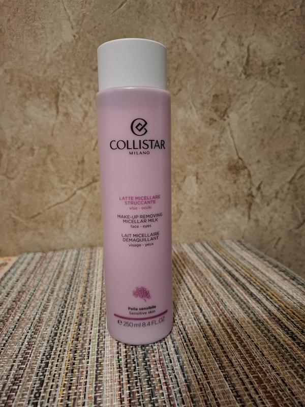 Завдяки вмісту пребіотиків і рослинних екстрактів, продукт покращує текстуру епідермісу, захищає його від негативного впливу зовнішніх факторів, запобігає повторній появі ознак дегідратації. Регулярне використання цього молочка перетворить рутинне вмивання на повноцінний доглядовий ритуал із неймовірними результатами! Особливості Make-up Removing Micellar Milk Face-Eyes від Collistar: - має делікатну формулу, що підходить усім типам шкіри; - сприяє її ефективному та безпечному очищенню; - справляється із залишками стійкої декоративної косметики, зокрема, навколо очей; - розчиняє сальні пробки, чорні цятки, вміст забитих пор; - пришвидшує їхнє звуження і зменшує видимість; - екстракт деревію чинить протизапальну дію; - дбайливо заспокоює подразнені ділянки епідермісу; - позбавляє його жирного блиску, регулюючи секрецію; - матує обличчя, даруючи свіжість, відчуття прохолоди; - пребіотик інулін зміцнює ліпідну мантію, захисний бар’єр; - нейтралізує негативний вплив зовнішніх факторів; - ефективний проти ознак дегідратації та слідів утоми; - запобігає повторній появі сухості, тьмяності, лущень. Тестер.Новий