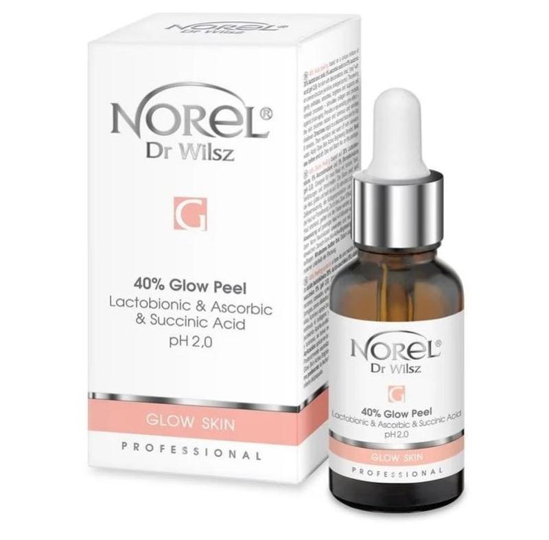 Опис: 40% Glow Acid Peel заснований на унікальній суміші 30% лактобіонової кислоти, 5% аскорбінової кислоти та 5% бурштинової кислоти (рН 2,0). Кислотний пілінг призначений для шкіри з пігментними плямами, стомленої сірої шкіри з нерівною структурою шкіри (зморшки, розширені пори). Пілінг м'яко відлущує, розгладжує, освітлює та підтримує процес оновлення клітин - стимулює вироблення колагену та захищає від фотостаріння. Кислотний пілінг забезпечує омолоджуючий ефект сяйва - шкіра стає сяючою та сяючою, зморшки розгладжуються. Активні інгредієнти: 30% лактобіонова кислота, 5% аскорбінова кислота, 5% бурштинова кислота, pH 2,0. Спосіб застосування: Помістити необхідну кількість пілінгу в скляний посуд і нанести за допомогою віялової кисті на очищене обличчя, шию і декольте (уникаючи області навколо очей, слизових оболонок носа і рту), залишити 4-10 хвилин і пацієнтів (при хорошій переносимості можна акуратно втерти засіб у шкіру), після закінчення часу витримки необхідно нейтралізувати пілінг нейтралізатором кислот, потім двічі промити теплою водою. Дизайн упаковки може змінюватись виробником