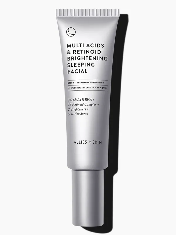 Ночной мультикислотный пилинг Allies Of Skin Multi Acids & Retinoid Brightening Sleeping Facial запускает процессы восстановления, уменьшает видимость пор и разглаживает рельеф. Утром кожа становится гладкой и сияющей без следов стресса и усталости. Пилинг эффективно улучшает внешний вид кожи, отшелушивает ороговевшие клетки, делает кожу гладкой и придает им бархатистую текстуру. Смягчает сухие участки, повышает уровень увлажненности, устраняет обезвоживание. Осветляет нежелательную пигментацию и постакне, выравнивает тон лица и придает коже здоровое сияние. Ночная пилинг-маска, состоящая из 7% AHA + BHA кислот, 1% ретиноидного комплекса, 7 осветляющих ингредиентов и комплекса пробиотиков, что улучшает микробиом кожи. Маска дает коже эффект профессионального ухода в течение ночи. Устраняет тусклость, сужает поры и увлажняет уставшую и проблемную кожу. Стимулирует обновление клеток, осветляет пигментные пятна и делает кожу сияющей. Снимает воспаление и ускоряет их заживление, защищает от окислительного стресса. Обладает эффектом химического пилинга, но при этом не вызывает шелушения и дискомфорта. Подойдет для всех типов кожи, особенно склонной к высыпаниям и пигментации. Главным действующим ингредиентом пилинга является комплекс кислот (7%): Гликолевая кислота получается из винограда и сахарного тростника. Бережно отшелушивает ороговевший слой, выравнивая рельеф лица и улучшая тон. Стимулирует выработку коллагена, повышает плотность и упругость кожи. Молочная кислота мягко отшелушивает ороговевший слой эпидермиса, стимулирует процессы заживления и восстановления, и способствует синтезу керамидов. Разглаживает микрорельеф, улучшает цвет лица, уменьшает размеры пор и заживляет. Салициловая кислота отшелушивает ороговевшие клетки кожи, стимулирует клеточное обновление, оказывает антимикробное действие, нормализует pH кожи и работу сальных желез, улучшает цвет лица. - Комплекс кислот 7% (гликолевая + молочная + салициловая кислота 1%) - смесь AHA (альфа-гидроксикислоты) и салициловой кислоты. Мягко удаляет мертвые клетки с верхнего слоя кожи, очищая поры и уменьшая появление акне и черных точек, одновременно увлажняя. - 1% ретиноидный комплекс. Способствует обновлению кожи и увеличивает выработку коллагена, выравнивает кожи и уплотняет тургор, обеспечивает освещение и лифтинг-эффект, способствуя разглаживанию мелких морщин. - L-аскорбиновая кислота (витамин С). В стабильной форме, не вызывает раздражения, сужает поры и тонкие линии, устраняет дефекты и устраняет неровную текстуру, улучшает барьерную функцию кожи и ее отличную способность удерживать влагу. - Комбуча. Ферментированный чай содержит ферментированные пробиотики, которые могут укрепить барьер кожи, повышая гидратацию, защищая кожу от повреждения свободными радикалами. - Шелковые аминокислоты. Натуральный водорастворимый гликопротеин, который извлекается из шелка-сырья и действует, как увлажнитель. Обладает успокаивающими и антиоксидантными свойствами и защищает кожу от агрессивных факторов окружающей среды. - Гиалуроновая кислота. Мощный увлажнитель, который связывает молекулы воды и доставляет ее в глубокие слои кожи, что делает его критическим фактором удержания влаги. - Ниацинамид. Восстанавливает барьерные функции, предотвращает появление акне, укрепляет тургор кожи, нормализ