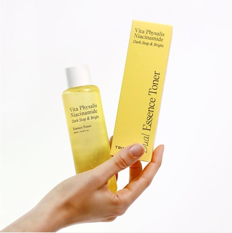 4.2026 Тонер-есенція Trimay Vita Physalis Niacinamide Dark Stop & Bright Essence Toner у найкоротші терміни наповнює шкіру вологою, повертає тонус і здорове сяйво, покращує колір шкіри, вирівнює тон та сприяє освітленню пігментних плям та постакне. Тонер інтенсивно зволожує шкіру, позбавляє сухості та тьмяного кольору обличчя, живить та відновлює захисні функції. До складу тонера входить 36.8% екстракту фізалісу, що має багатий антиоксидантний склад і вітаміни груп A, B, C, E, K. Фізаліс зменшує утворення зморшок і плям, надає освітлювальну дію та насичує шкіру масою корисних речовин. Глутатіон, аскорбінова кислота (вітамін С), ніацинамід та Resmelin HRпригнічують вироблення меланіну, освітлюють загальний тон шкіри, надають антиоксидантну дію та сприяють синтезу колагену. М'яка слабокислотна формула допомагає нормалізувати та підтримати здоровий кислотно-лужний баланс шкіри, зміцнює природний захисний бар'єр, а також нейтралізує агресивну дію проточної води.