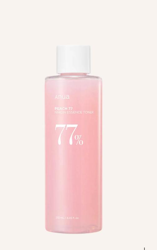 Зволожувальний тонер-есенція Anua Peach 77% з екстрактом персика -- це засіб для догляду за шкірою зі зволожувальним і освітлювальним ефектом. Екстракт персика (77%) інтенсивно зволожує, пом'якшує й тонізує шкіру, допомагаючи покращити її тон і текстуру. Ніацинамід сприяє зміцненню захисного бар'єра шкіри, регулює вироблення шкірного сала та має антиоксидантну дію, допомагаючи боротися із запаленнями та подразненнями. Тонер також містить пробіотики для підтримки мікробіому шкіри, гіалуронат натрію для збереження вологи та цераміди, які живлять і захищають шкіру від сухості. Він підходить для всіх типів шкіри та забезпечує комплексний догляд, роблячи шкіру м'якою, зволоженою та гладкою. Активні компоненти - Екстракт персика (77%): Зволожує, пом'якшує й покращує тон шкіри. - Ніацинамід: Зміцнює бар'єр шкіри, регулює вироблення себуму, має антиоксидантну та освітлювальну дію. - Пробіотик: Відновлює баланс мікробіому та знижує чутливість шкіри. - Гіалуронат натрію: Утримує вологу, покращує еластичність і регенерацію шкіри. - Цераміди: Зміцнюють і відновлюють захисний бар'єр, запобігають сухості. Переваги - Інтенсивне зволоження й освітлення. - Зменшення сухості та лущення. - Підходить для всіх типів шкіри. - Не містить спирту та не тестується на тваринах. Спосіб застосування Наносьте тонер руками або за допомогою ватного диска на очищену шкіру. Також можна використовувати як експрес-маску, змочивши ватні диски та залишивши їх на шкірі. Використовуйте вранці та ввечері. Об'єм: 250 мл.