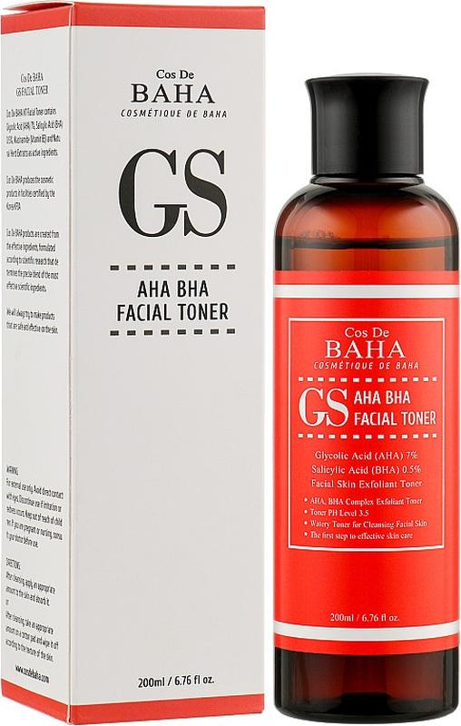 Весь асортимент оригінальної корейської та японської косметики Для замовлення перейдіть за посиланням ************ або пишіть в Viber +38********** Тонер для обличчя з кислотами для проблемної шкіри Cos De BAHA AHA/BHA GS Toner 200 мл Cos De BAHA – корейський бренд, який виготовляє високоякісну косметику з натуральними формулами, що забезпечують ефективний догляд за шкірою. Спеціально для епідермісу проблемного типу створений тонер із кислотами. Його активна формула сприяє делікатному відлущуванню ороговілих клітин, заспокоєнню запальних процесів, усуненню висипів. Засіб нормалізує роботу сальних залоз і вирівнює рельєф шкірного покриву, забезпечує гладкість і здоровий вигляд. Особливості Cos De BAHA AHA/BHA GS Toner: - рівень pH – 3.5; - на основі комплексу делікатних кислот; - містить трав ́яні екстракти та ніацинамід; - має ексфолірувальну властивість; - прискорює процеси клітинного оновлення й регенерації; - надає протизапальну, антибактеріальну та себорегулювальну дію; - сприяє звужуванню пор; - позбавляє комедонів, акне й вугрового висипу; - сприяє освітленню пігментних плям і наслідків постакне; - надає пом ́якшувальну та розгладжувальну дію; - вирівнює тон шкіри. Спосіб застосування : Нанесіть тонік за допомогою ватного диска після вмивання. Рекомендується використовувати засіб у вечірній час.