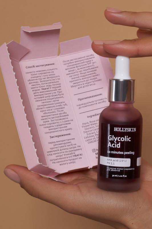 Кислотна пілінг-сироватка для обличчя Hollyskin Glycolic Acid 30мл Кислотна пілінг-сироватка миттєво покращує колір і мікрорельєф обличчя, дозволяє шкірі сяяти. М'яко відлущує відмерлі клітини, зволожує й освіжає, зменшує видимість вікової і сезонної пігментації, усуває постакне. При регулярному використанні зменшує глибину вікових і розгладжує мімічні зморшки, робить шкіру гладкою і шовковистою. Гідролат троянди й олія з насіння моркви у складі запобігають пересушуванню шкіри, відновлюють пружність і природній тонус, усувають видимі прояви втоми.