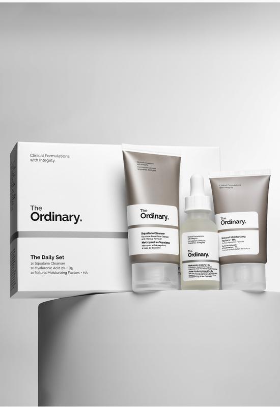 The Ordinary – The Daily Set – набір від бренду The Ordinary для щоденного догляду за обличчям. У набір входять. Активні компоненти: Squalane Cleaner - емульсія, що зволожує і очищає, м'яко видаляє макіяж, роблячи шкіру гладкою і зволоженою. Формула засобу містить сквалан разом з іншими ліпофільними ефірними оліями, які м'яко та ефективно розчиняють косметику. Об'єм: 50ml. Hyaluronic Acid 2% + B5 – сироватка з гіалуроновою кислотою (2%) та вітаміном B5, яка інтенсивно зволожує шкіру завдяки веганській гіалуроновій кислоті. У складі цієї сироватки є низько-, середньо-і високомолекулярна гіалуронова кислота, а також кросполімер гіалуронової кислоти нового покоління, завдяки чому молекули проникають у глибші шари шкіри. Об'єм: 30ml. Natural Moisturizing Factors + HA - крем для обличчя, що містить NMF (натуральний зволожуючий фактор) компоненти, які мають потужні зволожувальні властивості та захищають шкіру від надмірної втрати води. До них відносяться амінокислоти, які зміцнюють захисний бар'єр шкіри, піроглутамінова кислота, яка запобігає втраті води з епідермісу, і сечовина, що має пом'якшувальну дію. Об'єм: 30ml.