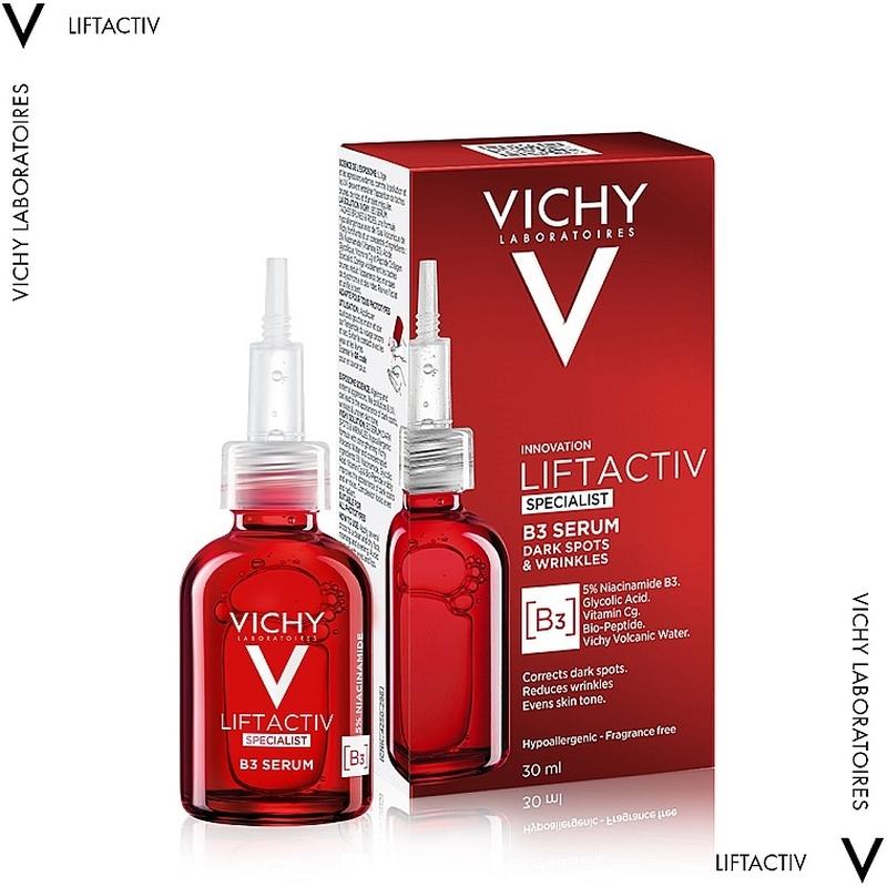 Термін 05.2027 За додатковою інформацією звертайтесь, з радістю проконсультуємо. Товар доставляється напряму з Франції. Особливості Vichy Liftactiv Secialist B3 Serum: - допомагає зменшити прояви ознак старіння шкіри; - вирівнює та освітлює тон обличчя, надає йому привабливого сяйва; - знижує виразність пігментації; - зменшує кількість і глибину зморщок, запобігає утворенню нових; - має легку консистенцію, швидко поглинається; - містить ніацинамід, який скорочує вироблення меланіну, освітлює та заспокоює шкіру; - комплекс кислот м'яко відлущує верхній шар епідермісу та освітлюють його тон; - вітамін С стимулює оновлення шкіри та надає освітлювальний ефект. Спосіб застосування: Кілька крапель сироватки наносити на очищену суху шкіру обличчя двічі на день, вранці та ввечері. Уникати контакту зі шкірою навколо очей і губ.