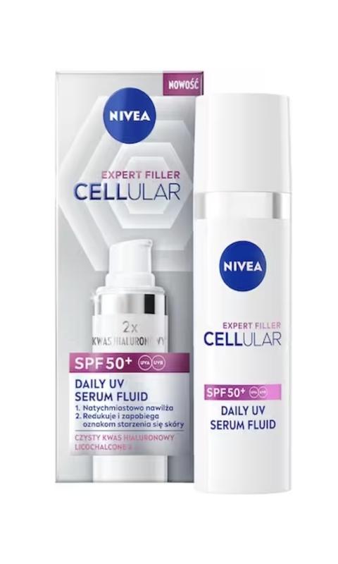 Захисний флюїд NIVEA CELLULAR EXPERT FILLER (СЕЛЛУЛАР ЕКСПЕРТ ФІЛЛЕР) SPF 50+ — це інноваційний засіб, який допомагає запобігти передчасному старінню шкіри завдяки своїй потужній формулі. Його щоденне використання не тільки мінімізує негативний вплив ультрафіолету, а й активно коригує ознаки старіння. Текстура флюїду робить нанесення приємним ритуалом, а ефективні компоненти у складі проникають глибоко у шкіру, забезпечуючи максимальний ефект. SPF50+ гарантує надійний захист від UVA/UVB-променів. Мікро- та макро-гіалуронова кислота інтенсивно зволожує, стимулює власний синтез гіалурону та розгладжує дрібні зморшки. Лікохалкон А активно захищає клітини шкіри від оксидативного стресу та негативного впливу довкілля, сприяючи збереженню молодості. Використовуйте його щодня, щоб побачити результати вже за кілька тижнів. Особливості захисного флюїду NIVEA CELLULAR EXPERT FILLER SPF 50+: - захищає від шкідливого впливу UVA- та UVB-променів; - стимулює вироблення власної гіалуронової кислоти; - дарує відчуття гладкості та зволоження; - зменшує дрібні та глибокі зморшки; - містить два типи гіалуронової кислоти; - підвищує еластичність шкіри; - бореться з наслідками негативного впливу зовнішнього середовища. Захисний флюїд NIVEA CELLULAR EXPERT FILLER (СЕЛЛУЛАР ЕКСПЕРТ ФІЛЛЕР) SPF 50+ стане вашим незамінним помічником у щоденному догляді за шкірою!