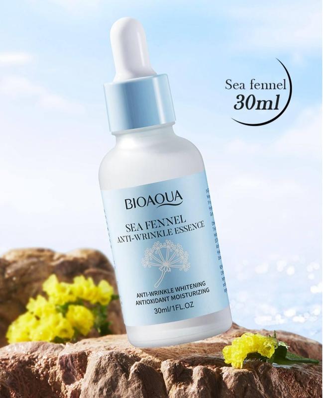 Для комплексного догляду, додаткового зволоження та омолодження шкіри обличчя фірми Bioaqua представляє есенцію проти зморшок з екстрактом морського фенхелю та гіалуроновою кислотою. Косметична сироватка випускається з дозатором для зручного нанесення, має легку консистенцію, добре вбирається та не залишає відчуття стягнутості. Есенція інтенсивно наповнює шкіру вологою, бореться з появою сухості та лущення, знімає подразнення та почервоніння, підтягує шкіру та підвищує її щільність. Екстракт фенхелю, який входить до складу сироватки, має антиоксидантну дію, розгладжує дрібні зморшки, бореться із запальними процесами. Гіалуронова кислота перешкоджає втраті вологи, підвищує пружність та еластичність шкіри, захищає від негативних впливів навколишнього середовища та передчасного старіння. Есенція вирівнює тон і підтягує шкіру, покращує колір обличчя та позитивно впливає на зовнішній вигляд та загальний стан шкіри, нормалізує обмінні та відновлювальні процеси, покращує мікроциркуляцію крові та живить шкіру корисними речовинами. Регулярне використання сироватки в б'юті процедурах омолоджує та оздоровлює шкіру, пом'якшує та надає доглянутого вигляду.