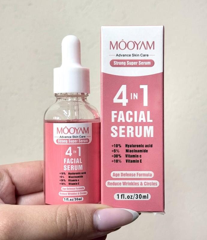 Антивікова сироватка для обличчя 4 IN 1 - це ефективний засіб для боротьби з ознаками старіння. Її потужна формула, що містить гіалуронову кислоту, ніацинамід, вітаміни C та E, зволожує, живить та відновлює шкіру, повертаючи їй молодість і сяйво. Гіалуронова кислота 10%-зберігає вологу в шкірі, запобігаючи її сухості та в'ялості. Ніацинамід допомагає 5%-зменшити пігментацію та покращує текстуру шкіри. Вітамін C 30%-стимулює вироблення колагену, що сприяє зменшенню зморшок. Вітамін E 10%-зберігає шкіру захищеною від впливу навколишнього середовища. Сироватка швидко вбирається, не залишаючи жирного блиску, і підходить для всіх типів шкіри. Регулярне застосування забезпечує помітне покращення зовнішнього вигляду шкіри - вона стає гладкою, еластичною та молодою. Спосіб застосування: Нанести на суху очищену шкіру обличя, втерти легкими масажуючими рухами кінчиків пальців до повного вбирання. Після цього нанести крем для обличчя. Можна використовувати вранці та ввечері.