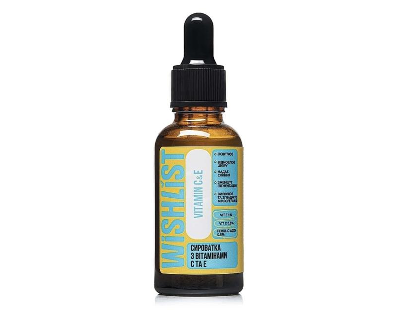 Сироватка для обличчя з вітамінами С та Е від бренда Wіshlіst — це продукт для молодості та сяяння вашої шкіри. Формула б’юті-засобу поєднує потужні антиоксиданти, які інтенсивно живлять і зволожують епідерміс, а також ефективно борються з пігментними плямами та ознаками старіння. Регулярне використання продукту допомагає вирівняти тон обличчя та надати шкірі здоровий, сяйнистий вигляд. Нанеси на очищену шкіру тонким шаром, дай поглинутися 10-15 хвилин і при потребі нанеси крем. Для найкращих результатів використовуйте щодня.