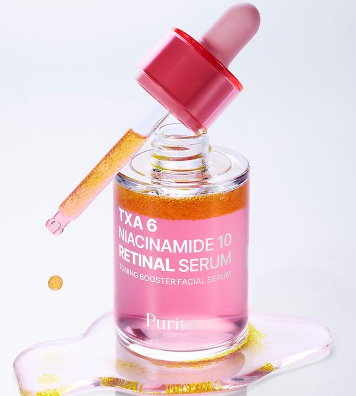 Purito Seoul TXA 6 Niacinamide 10 Retinal Serum -- ночная активная сыворотка против пигментации, постакне и морщин. Формула сочетает в себе ретиналь -- более сильную и быструю форму ретиноидов, и 10% ниацинамида, направленного на уменьшение пор, выравнивание тона и себоконтроль. 6% транексамовой кислоты (TXA) эффективно борется с тёмными пятнами, предотвращает появление новых и возвращает коже чистый и светлый вид. * * * Активные ингредиенты: - ⭐ Ретиналь 0.01% -- морщины, обновление клеток, акне-контроль - 🌟 Ниацинамид 10% -- осветление, стягивание пор, матирование - ✨ Транексамовая кислота 6% -- постакне и пигментация - 🌿 Пантенол + аденозин -- восстановление и разглаживание * * * Для какой кожи: ✔ комбинированная, жирная, нормальная ✔ акне, постакне, тёмные пятна ✔ неровная текстура и возрастные изменения * * * Преимущества: ✔ Борется с пигментацией и постакне ✔ Осветляет тон и выравнивает рельеф ✔ Сужает поры и контролирует жирность ✔ Смягчает морщины и повышает гладкость кожи * * * Рекомендации по применению: - Только вечером, сначала 2-3 раза в неделю - Днём обязательно SPF 50+ - Не сочетать в одну ночь с сильными кислотами и ретиноидами