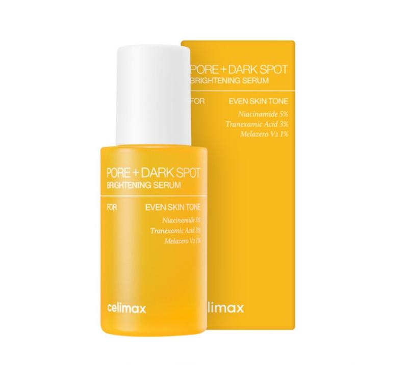 Celimax Pore + Dark Spot Brightening Serum - сироватка для гучності з освітлювальною дією. Формула продукту містить ніацинамід, який регулює роботу сальних залоз, звужує пори і разом з транексамовою кислотою освітлює пігментні плями, вирівнюючи тон шкіри і повертаючи їй здорове сяйво. Підходить для всіх типів шкіри з пігментацією та постакне. Особливості Celimax Pore + Dark Spot Brightening Serum: ✔️ 5% ніацинаміду (вітамін B3) має багатофункціональну дію: регулює себовиділення, усуває жирний блиск, освітлює і перешкоджає появі пігментації, а також стимулює вироблення колагену, підвищуючи пружність та еластичність .✔️ 3% транексамової кислоти - освітлювальний актив, пригнічує активність тирозинази - ферменту, який запускає вироблення пігменту меланіну. Не викликає фоточутливості, може використовуватись у денному догляді ✔️ М'яко освітлює пігментацію та постакне, покращує загальний тон, усуває тьмяність та дарує здорове сяйво ✔️ Вирівнює текстуру шкіри, звужує розширені пори ✔️ Має щільну текстуру, не залишає липкості, приємно освіжає при нанесенні. Не провокує сухості та подразнення, не містить ароматизаторів Склад: Aqua, Glycerin, Butylene Glycol, Niacinamide, Tranexamic Acid, 1,2-Hexanediol, Methylpropanediol, Vinyl Dimethicone, Glycereth-26, Isononyl Isononanoate, Eriobotrya Japonica Leaf Extract, Mentha Viridis (Spearmint) Extract, Sodium Hyaluronate, Propanediol, Cetearyl Olivate, Sorbitan Olivate, Sodium Acrylate/Sodium Acryloyldimethyl Taurate Copolymer, Isohexadecane, Hydroxyethyl Acrylate/Sodium Acryloyldimethyl Taurate Copolymer, Ammonium Acryloyldimethyltaurate/VP Copolymer, Disodium EDTA, Carbomer, Sorbitan Oleate, Tromethamine, Sorbitan Isostearate, Bisabolol, Polysorbate 20, Polysorbate 80, Polysorbate 60, Ethylhexylglycerin Застосування: Нанести відповідну кількість сироватки на очищену і тонізовану шкіру обличчя.